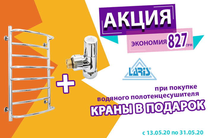 Компания Laris спешит порадовать Вас приятными майскими новостями. Вы можете выбрать подарок себе по душе! При покупке избранных моделей полотенцесушителей краны в подарок (кран угловой Laris 1/2" - 3/4" Обычный (LX-8202)) или скидка 10% на товар с акционным стикером. Скидка высчитывается менеджером от начальной сумы после оформления заказа (и выбора бонуса!). Период действия акции - 13.05.2020-31.05.2020.