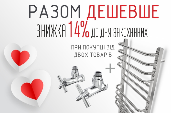 Традиционно ко Дню влюбленных мы радуем наших клиентов приятными скидками. Скидка 14% действует на весь заказ при условии покупки двух или более товаров одним чеком. Категория и вид товара значения не имеют – потому что вместе всегда лучше!
