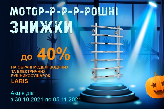 Знижки присвячені до Вечора всіх святих допоможуть подолати осінню хандру. Адже Хеллоуїн це не тільки привід повеселитись та вдягнути страшний костюм, але і жахлива економія на покупках! Протягом семи днів (мотор-р-р-р-рошно надовго!) знижки на обрані моделі водяних та електричних рушникосушарок досягатимуть до 50%. В список акційних товарів увійдуть найбільш популярні моделі рушникосушарок та нова серія Альфа R3 в чорному кольорі!