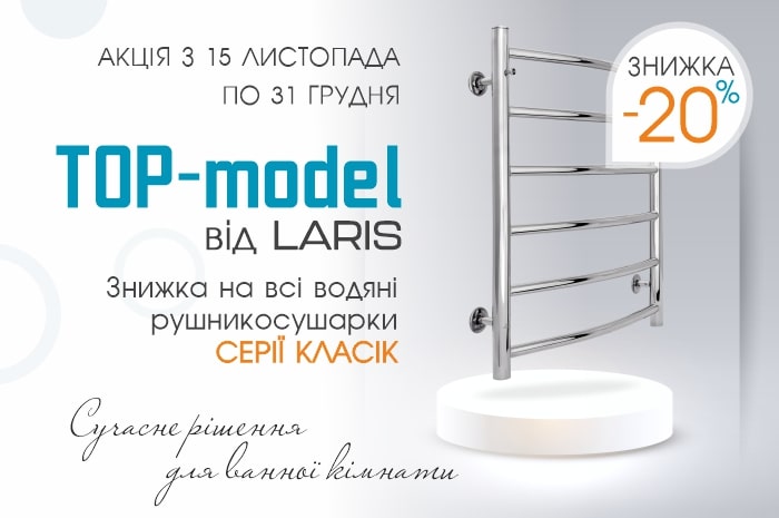 Знижка в розмірі 20% від початкової вартості дійсна на TOP-model від Laris. Осінньо-зимовий топ очолила серія Класік! Водяні рушникосушарки серії Класік (включаючи моделі з боковим підключенням) доступні до замовлення. Поспішайте придбати продукцію за зниженою ціною. Для покупки достатньо перемістити товар у кошик, не загубивши свою знижку!